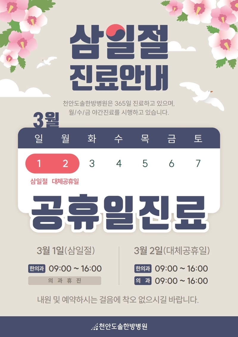 천안도솔한방병원은 삼일절(대체공휴일)에도 진료합니다.